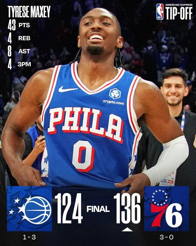 馬克西43分4板8助,埃奇庫姆26分7助,。埃奇庫姆打破艾弗森紀(jì)錄 隊史前三場比賽得分第二多!